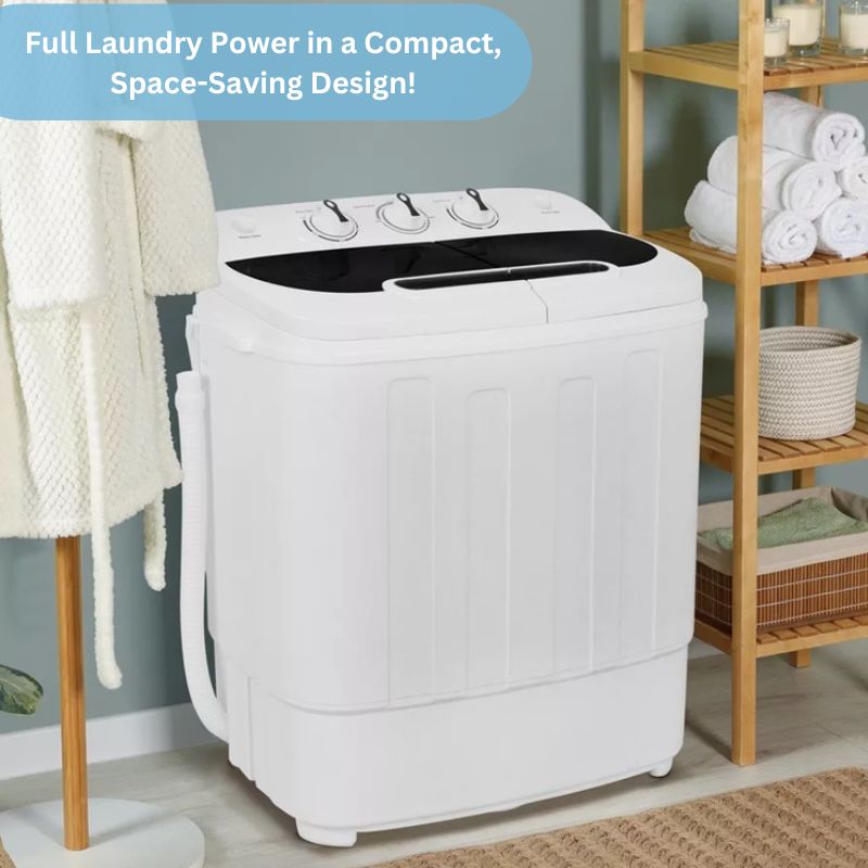 With this top loading washing machine with a dryer, simply add clothes, water, and detergent, then set it to wash—no plumbing required. Just connect to a water source and drain area, and you're all set. It's the hassle-free solution for apartments, dorms, RVs, or camping sites where plumbing options are limited.