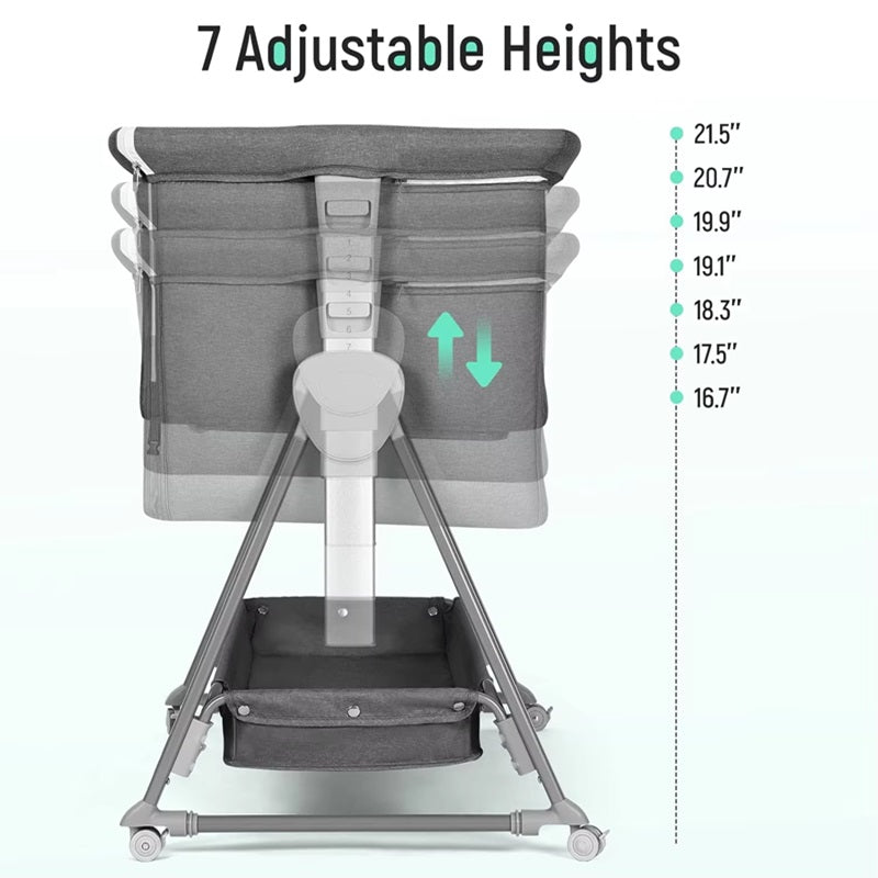 Our Baby Bassinet is designed with a secure attachment that connects tightly to your bed, ensuring safe and easy access to your baby throughout the night. With 7 adjustable height settings, it aligns seamlessly with your bedside, making it the perfect co sleeper bassinet for convenient nighttime care and peace of mind.