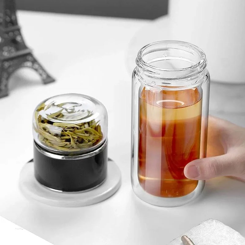 The double-wall glass construction of our tea infuser bottle ensures that the inside temperature stays insulated, allowing you to comfortably hold your bottle while keeping your tea hot or cold. Enjoy your tea infuser bottle without the worry of overheating or condensation, making it perfect for both hot and cold beverages.
