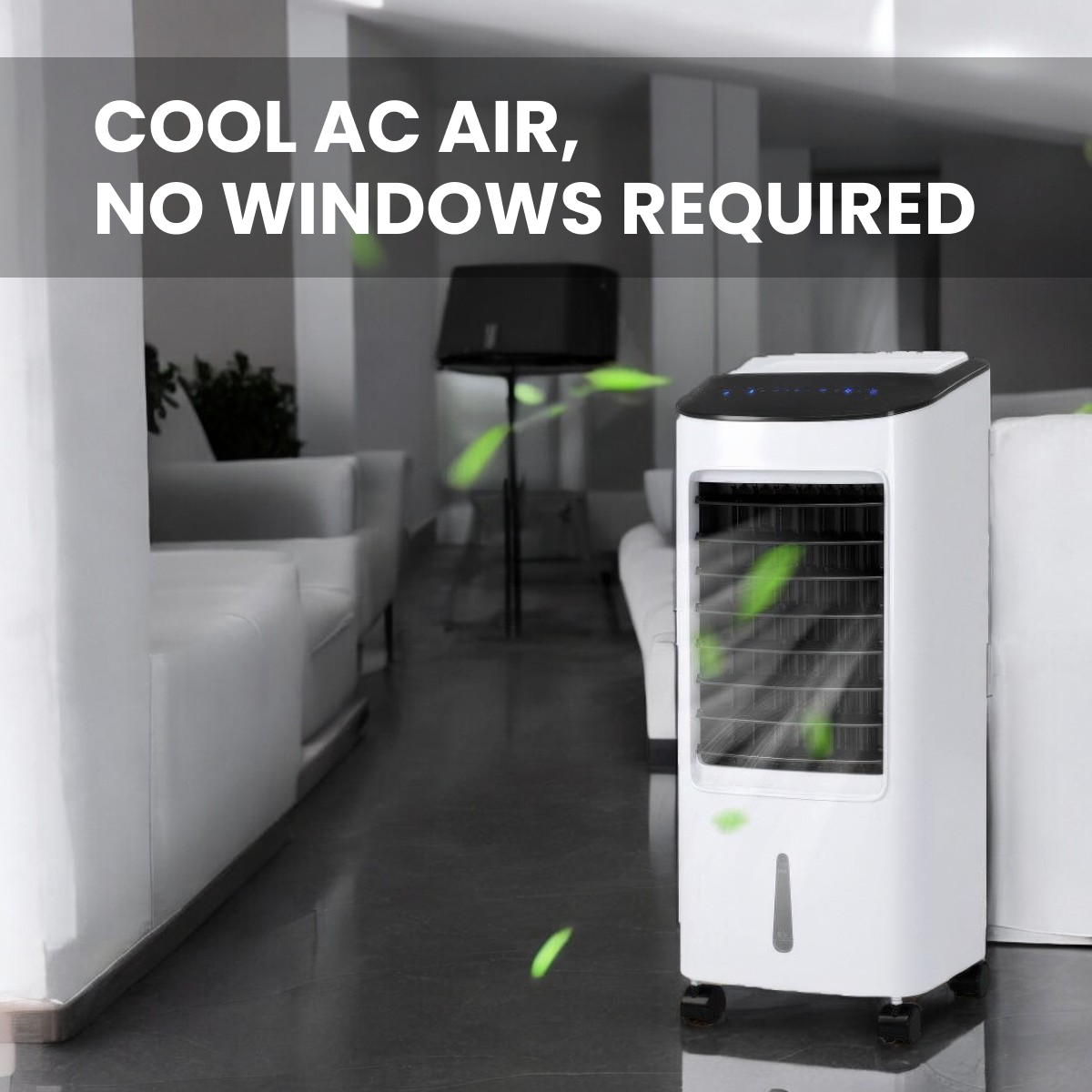 This indoor, windowless portable air conditioner is the ultimate solution if you need a mobile cooling option. With wheels for easy transport, it's a convenient choice that not only keeps you cool but also saves you money. Unlike traditional units, this stand-up AC requires no vent or window.