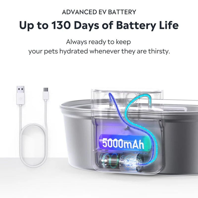 With up to 130 days of battery life powered by an advanced EV battery, this stainless steel cat water fountain ensures your pet stays hydrated without constant recharging. Whether you’re home or away, rest easy knowing your pet has access to fresh water.