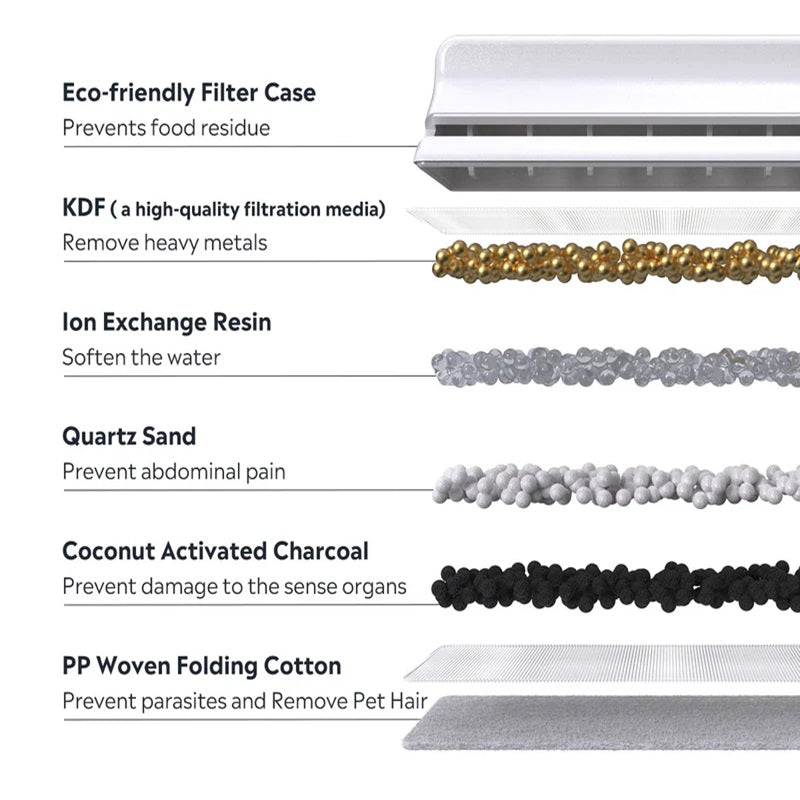 Our Cat Pet Water Fountain is equipped with an advanced 6-level filtration system, making it the best cat water fountain for maintaining your cat's health. With filters made from KDF, quartz sand, and coconut activated charcoal, this stainless steel cat water fountain ensures your cat enjoys the freshest, cleanest water every day. This comprehensive filtration system helps protect your pet from urinary issues by delivering pure, contaminant-free hydration.