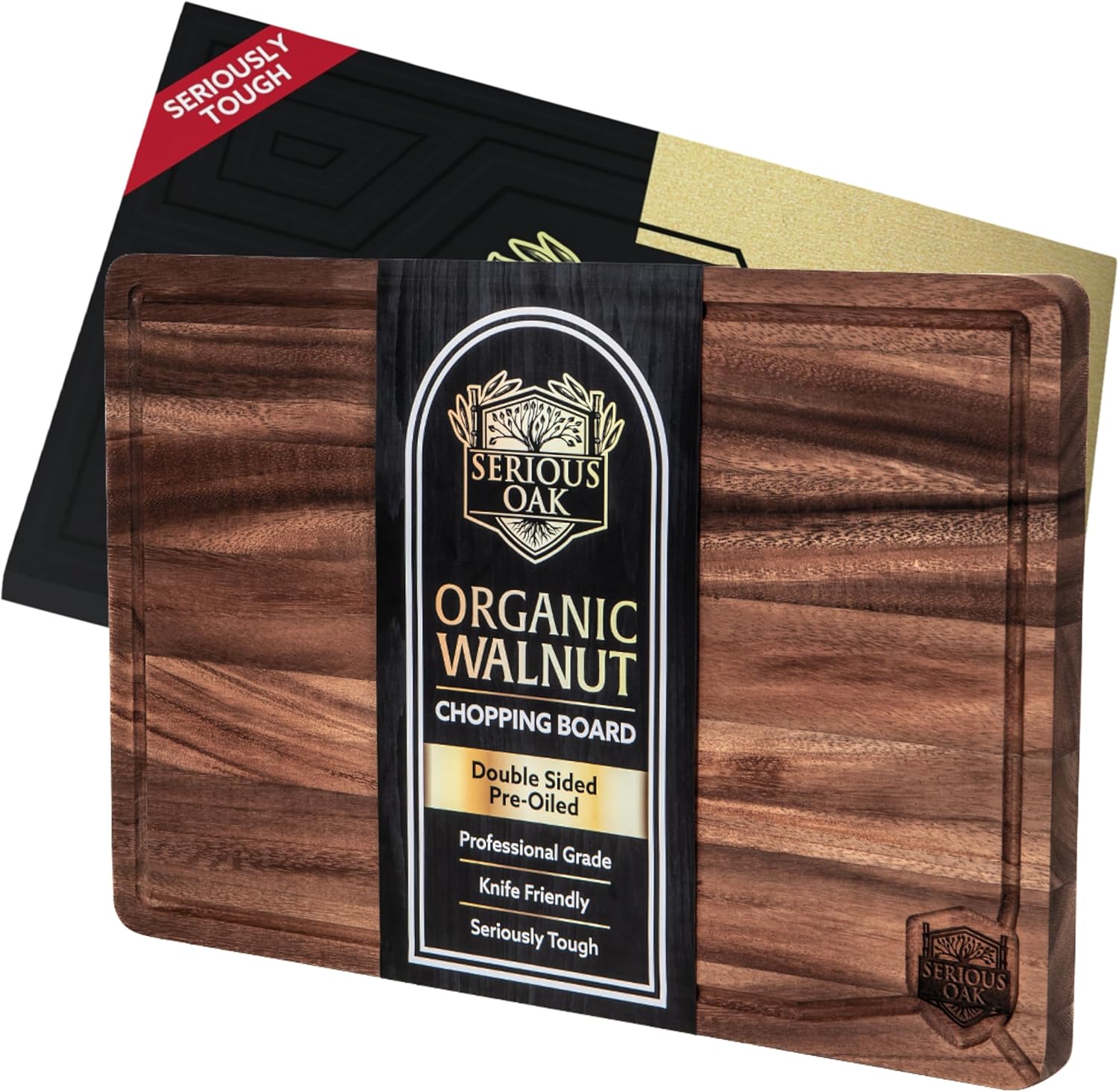 Crafted from organic walnut, this Serious Oak walnut chopping board is a powerhouse of durability, ready to withstand daily kitchen demands. The robust hardwood ensures a reliable cutting surface. No nasties here – it's finished safely, free of BPA, formaldehyde, and phthalates.