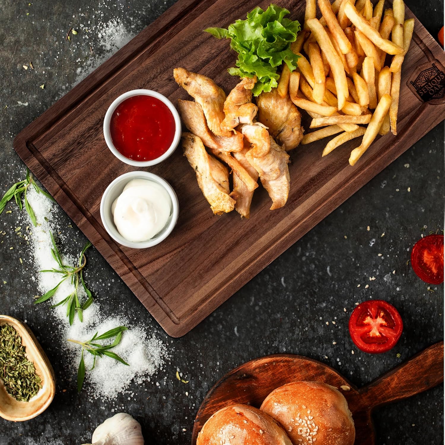 The reversible walnut cutting board is just right at 18" x 12". It's the ideal sidekick for all your kitchen tasks – slicing, dicing, chopping – you name it. This giant cutting board gives you plenty of space for easy meal prep, and guess what? It doubles as a walnut charcuterie board.